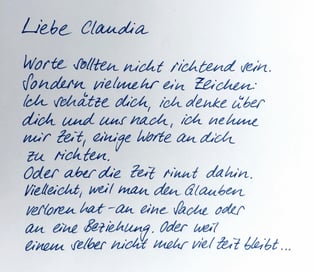 Sie möchten Ihren persönlichen Brief in eigener Handschrift überbringen? Meinen abgesegneten Textvorschlag erhalten Sie per Mail oder Post und können diesen eigenhändig abschreiben.